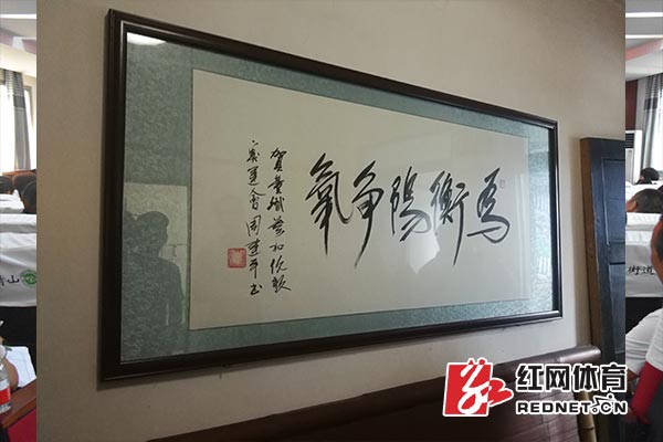 客厅的墙上挂着“为衡阳争气”的书法作品,这是为了祝贺董斌参加伦敦奥运会而作。时隔6年,当董斌以三级跳的姿势点燃了省运圣火,他再一次为衡阳增光彩。