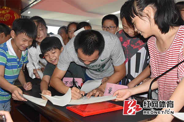 董斌被孩子们围着索要签名。