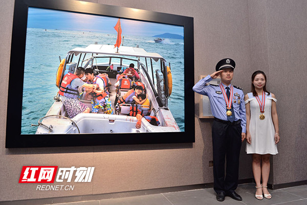 展馆内,一对年轻夫妻在聚光灯下格外引人注目。女子瘦弱,一袭短袖白裙,右手臂上长长的疤痕触目惊心,笑容却恬静又温柔;身边的男子警服左袖口露出的疤痕清晰可见,一脸平静。