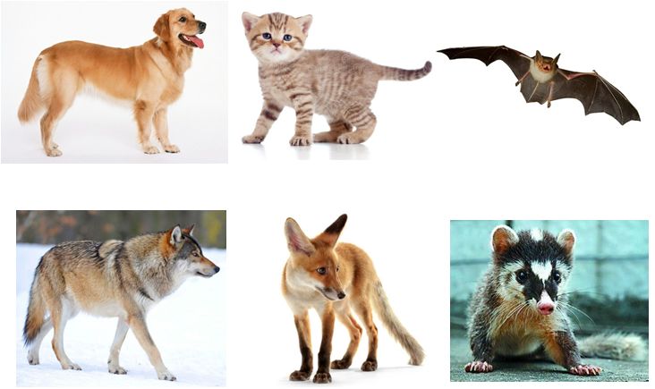 理论上所有哺乳类动物均可感染狂犬病毒,狂犬病在自然界的储存宿主动物包括食肉目动物和翼手目动物,易感动物主要包括犬科、猫科及翼手目动物(蝙蝠)。而禽类、鱼类、昆虫、蜥蛎、龟和蛇等不感染和传播狂犬病病毒。除了由非常罕见的感染组织和器官移植而引起的病例外,狂犬病在人与人之间的传播并未得到证实。我国报告的病例主要由犬伤导致,约占90%左右;其次为猫,占5%左右,其他动物包括马、松鼠、猪、蝙蝠、猴和獾等,但较为少见。