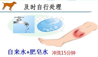 其中第一步处理伤口非常重要,大家记住一定要在第一时间用流动的自来水和肥皂水交替冲洗15分钟,这样能最大程度降低感染风险。