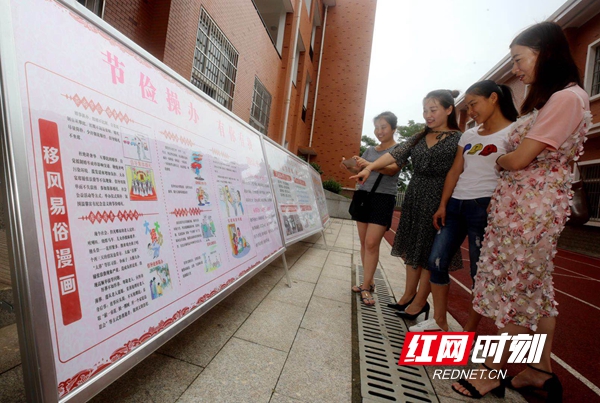 居民们一起通过宣传栏学习移风易俗相关知识。