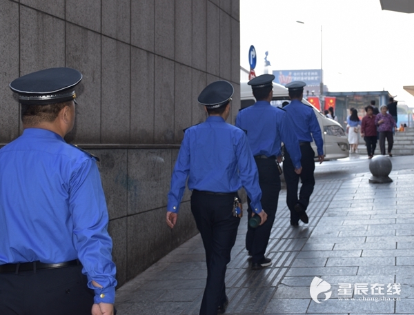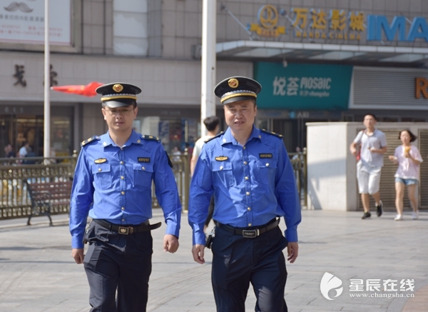 早上八点,天心区城管执法大队坡子街中队几名队员开始在管辖地巡逻,一些人流量较大的街口位置还派有专人守点,紧盯流动商贩、占道停车等现象。坡子街中队邹军荣告诉星辰全媒体记者,“我们实际上是各部门联动,包括和交警、民政、环卫等部门一起行动。同时,还和五一商场的各大物业公司落实‘门前三包’,形成合力,取得了很好的效果。”