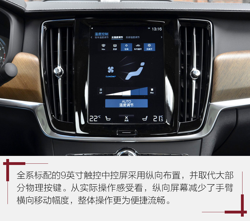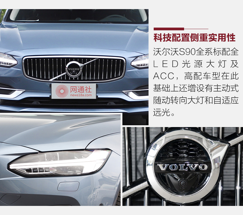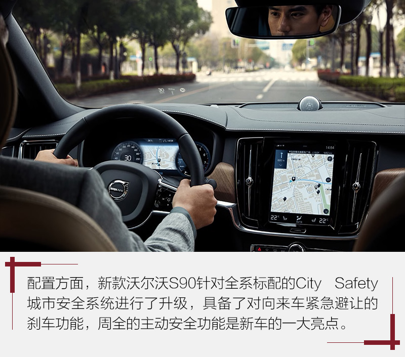 在安全配置方面,新车全系标配的City Safety城市安全系统此次增加了对向来车紧急避让的刹车功能。Pilot Assist自动驾驶辅助系统能够在缓慢的拥堵路况下,以及行车速度高达最高130公里/小时的长距离高速车道上为驾驶员提供转向支持、车距保持和速度控制等辅助。此外,沃尔沃S90还全系标配有ACC自适应主动巡航功能。