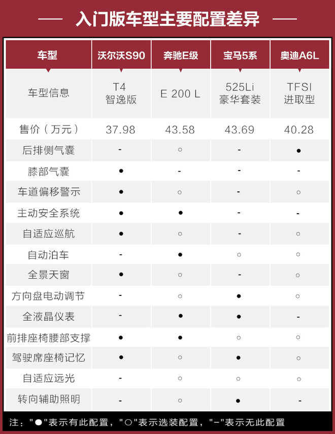今天我们列举的4款中大型豪华车都带有各自的卖点和优势。其中,沃尔沃S90作为同级别的后起之秀拥有十分抢眼的综合实力。因此如果一定要横向对比选择的话,沃尔沃S90应该是4款车型中最具性价比优势的车型。我们以4款车型的入门版为例,对主要配置差异进行对比。