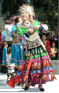 一套女装,做工精细的,缝工绣工要花近两百个工日。在大型祭祀活动中的礼裙更为艳丽。礼裙长而宽,缝成褶叠,下脚边沿满绣色彩缤纷的花纹、花瓣,礼裙系于腰间,围满下身前后,舞蹈起来,随风摇曳。