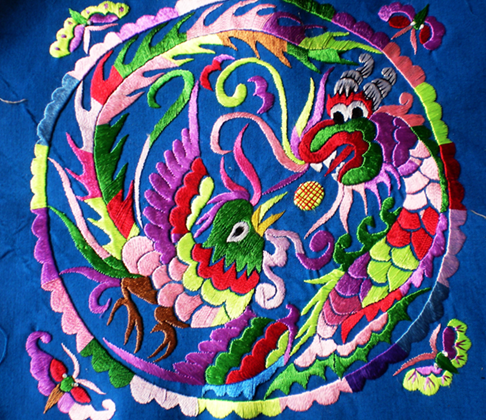 苗绣中形象各异的蟠龙、飞鸟、蝶、花、鱼、虾,既是来自对大自然的膜拜,也是苗族妇女对自由生命的讴歌和对美好事物的崇尚。苗绣构图紧凑、饱满,偏重红、绿、蓝、黑等色,在协调中讲究纯度、明度、冷、暖及色彩的强烈对比,其纹样、色彩的夸张变化,既着意于生气勃勃的客观对象的表现,又揉进梦幻的幻想色彩,形成了苗绣独特的艺术风格。