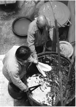 入染:将刮有灰浆的白布晒干,在45℃温水中浸泡,在温水中加入适量猪血浆,可紧固灰浆,同时染后呈紫色,直至浸泡发软后即可入染。