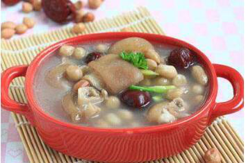 做法:花生米、大枣置碗内用清水洗净、浸润。将猪蹄出毛洗净,煮四成熟捞出,用酱油拌匀。锅内放油,上火烧七成热,将猪蹄炸至金黄色捞出,放在炒锅内,注入清水,同时放入备好的花生米、大枣及调料,烧开后用小火炖烂即可。