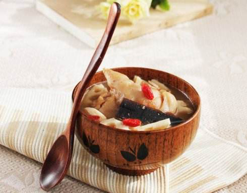 原料:灵芝30克,黄精15克,鸡血藤15克,黄芪18克,猪蹄250克,味精、精盐各适量。