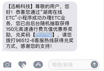 如果你在10月15日-11月11日期间,在【湖南在线ETC】小程序上在线申请了ETC,且符合前300名新用户的条件,在支付成功后,系统会短信通知你获得了高速通行费,金额为50元、100元或者150元不等。