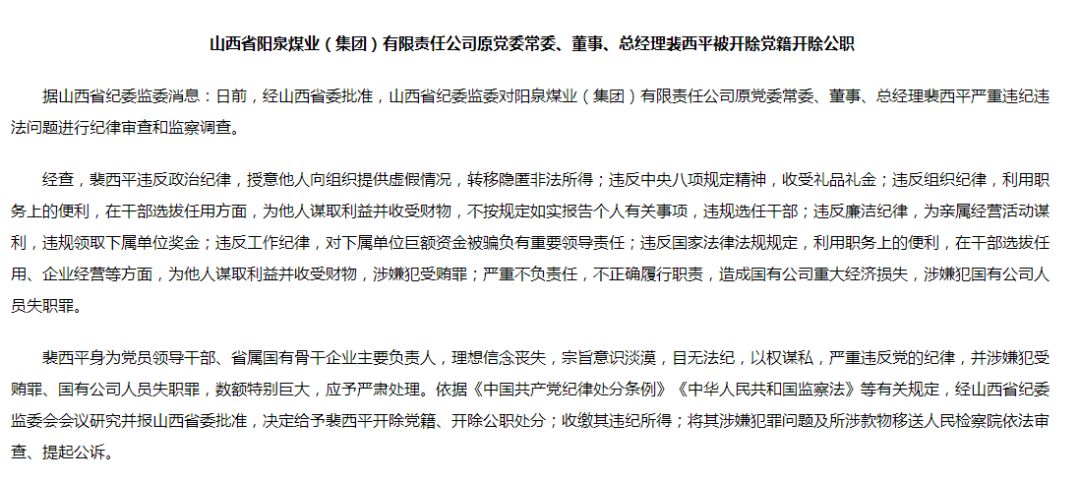 可能有读者知道,这是阳煤集团前任总经理。今年5月,山西省纪委监委消息,山西省阳泉煤业(集团)有限责任公司董事、党委常委、总经理裴西平涉嫌严重违纪违法,接受山西省纪委监委纪律审查和监察调查。3个月后,8月15日,裴西平被双开。