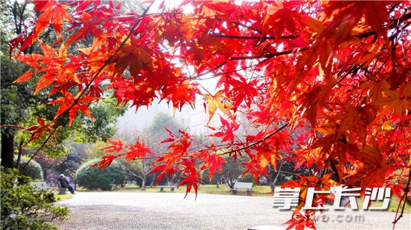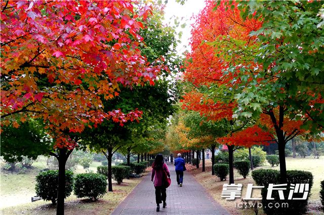 从省政府门口进入湘府文化公园,从北到南,路两边就是红枫,虽然树没有成片或是并排,但每一株的叶子都红得特别好看。