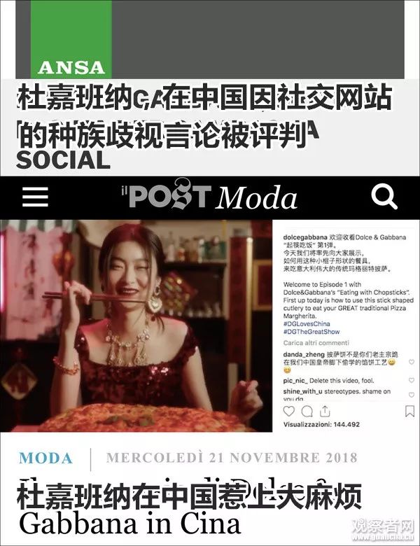 意大利媒体用“灾难”来形容这次的风波,并称D&G涉嫌存在种族歧视和性别歧视。”