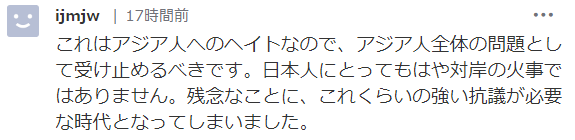 因为这是对亚洲人的仇恨,所以应该作为整个亚洲的问题来对待。日本不能隔岸观火了啊