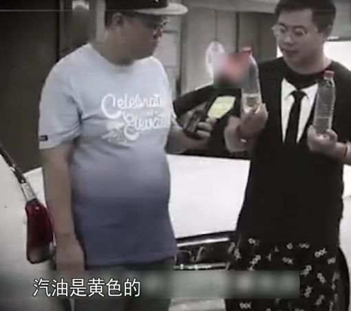 两个男子从德国产汽车中抽出原装汽油,然后和我国国内汽油对比。对比发现,德国汽油是无色的,而国内汽油是淡黄色,因此得出结论:无色的汽油品质更好。