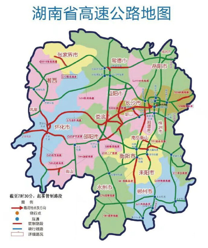 因起雾,湖南省内20条高速、1条主干道、共118个收费站实行交通管制,车辆只出不进,共涉及长沙、湘潭、衡阳、邵阳、常德、张家界、怀化、娄底等8个支队辖区。