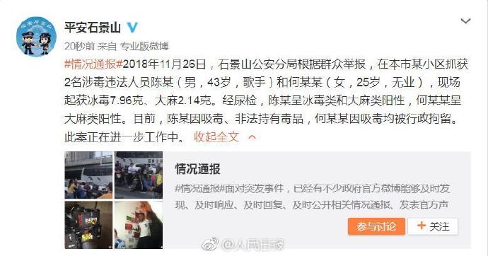 据@平安石景山 消息,2018年11月26日,石景山公安分局根据群众举报,在本市某小区抓获2名涉毒违法人员陈某(男,43岁,歌手)和何某某(女,25岁,无业),现场起获冰毒7.96克、大麻2.14克。经尿检,陈某呈冰毒类和大麻类阳性,何某某呈大麻类阳性。目前,陈某因吸毒、非法持有毒品,何某某因吸毒均被行政拘留。此案正在进一步工作中。