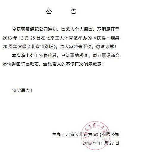羽泉演唱会的举办方发布公告称,接到羽泉经纪公司通知取消12月25日北京工体演唱会,并开始退票。