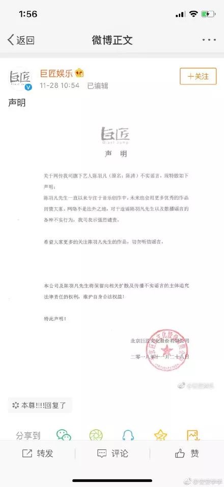 2、今天上午10点,陈羽凡的公司@巨匠娱乐 发表声明,否认网曝关于陈羽凡的不实传闻,称:“陈羽凡先生一直专注于音乐创作中。”并表示“对于造谣陈羽凡先生以及散播谣言的各种不实行为,我司表示强烈谴责。”
