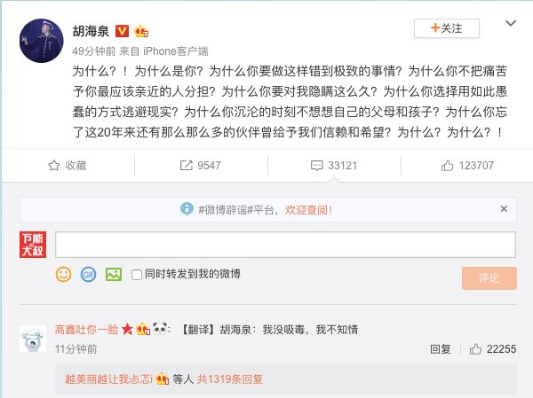 刚刚,胡海泉发微博发出10个为什么?从表面上看,这是对合作多年朋友干出这种事的惋惜,实际传递了两个核心信息:“我没吸毒,我不知情”。