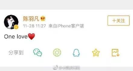 3、最关键的来了,一个多小时后,今天上午11时27分,陈羽凡的个人微博更新,并写道:“One love ”。以此行为来为自己吸毒被抓的事辟谣。