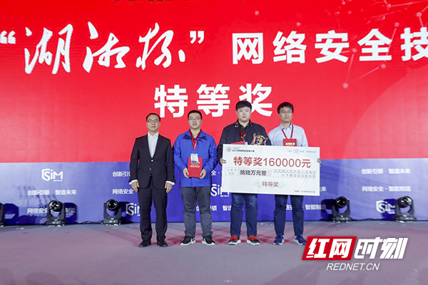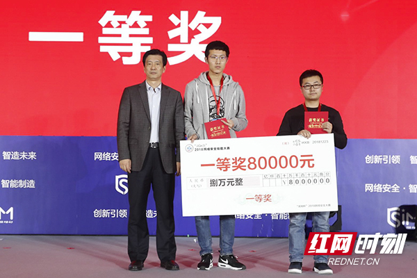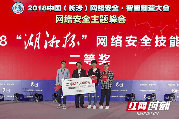 中央网信办副主任刘烈宏(左一)为2018“湖湘杯”网络安全技能大赛特等奖“护网先锋队”颁奖。