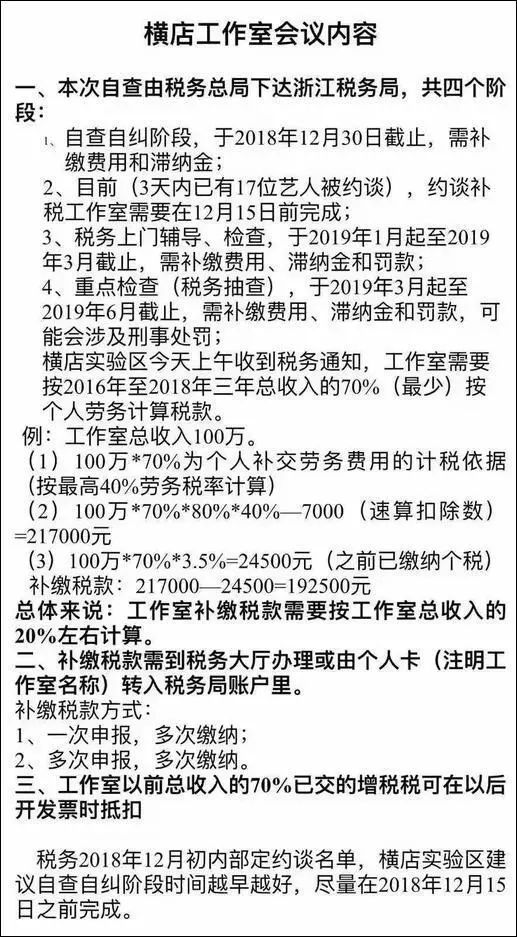 这则名为《横店工作室会议内容》的通知显示,影视工作室需要针对自身的缴税情况进行自查自纠,并启动补税工作,总体来看,“工作室补缴税款需要按工作室总收入的20%左右计算”。