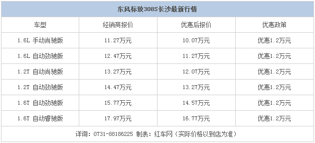 红车网长沙10月27日讯(时刻新闻记者 龙真)今天,红车网从长沙鹏驰东风标致4S店了解到,东风标致308S全系优惠1.2万元,店内有现车。具体体优惠详情请见下表: