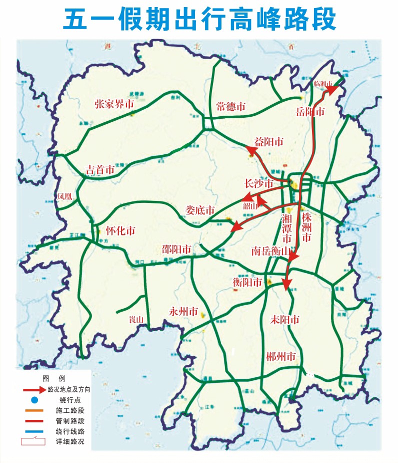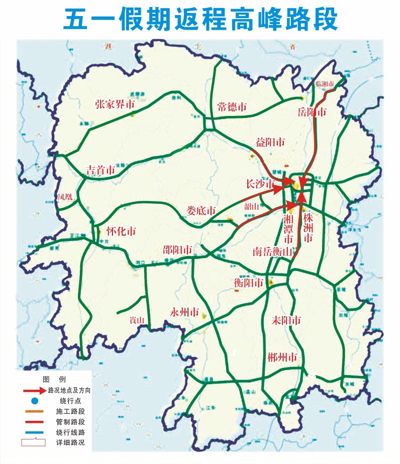 5月3日14点至21点,全省高速将出现以长株潭地区为主要出行目的地的返程车流高峰:长张高速长益段往东方向、沪昆高速湘潭段往东方向、京港澳高速长潭段往北方向、京港澳高速临长段往南方向、长韶娄高速往东方向将出现返程高峰。