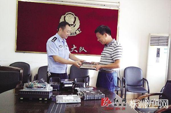 民警将追缴回来的挖机显示屏和电路板还给挖机师傅(记者胡乐 摄)