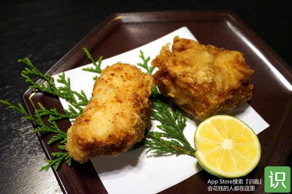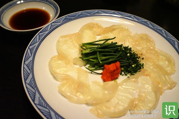 接下来上的是河豚刺身。河豚刺身一般切得较薄,一些餐厅还会将切得极薄的河豚刺身摆成仙鹤等造型。而多古安的刺身一反常态,切得有些厚,更显出河豚肉的韧劲来。