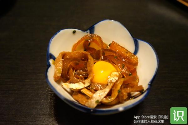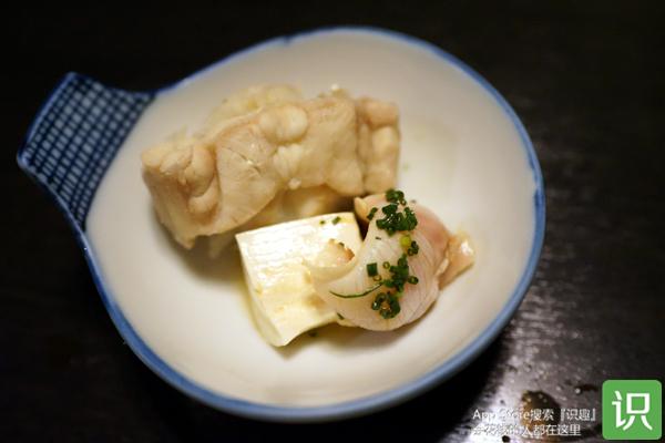 首先,一般会有一份前菜,通常提供的是河豚皮或河豚脸部的肉。多古安上的这份是用酸橘醋调味过的河豚皮,还在里面加了一颗小的生鸡蛋。