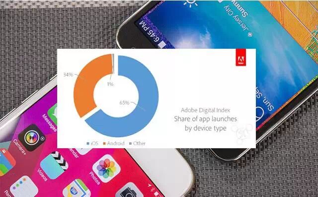 这份来自 Adobe Digital Index(ADI)发布的数据搜集了来自总共 7 亿的应用使用数。在这些数据中,ADI 表示有 65%的应用启动来自 iOS,而安卓则占据 34%。此外,数据还显示 iOS 应用被打开和使用的时间是安卓的两倍。