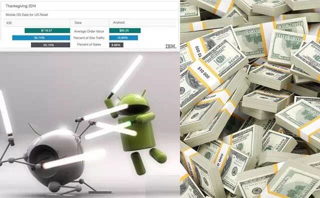根据IBM的最新数据,2014圣诞节期间,iOS占全部在线销售的27%,这个数据是安卓的四倍,安卓只占7.6%的销售额。而在更早些的“黑五”购物狂欢中,iOS用户占网购总量的25%,而安卓只占不到7%。此外,iOS用户的平均购买总价也更高,达到了118.57美元,安卓用户的平均购买价格只有95.25美元。