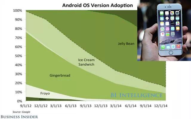 根据苹果开发人员公布的数据,在iOS 8新系统在正式发布七周半之后,它已经安装到了56%的iOS设备上。在10月16日的iPad芯片发布会上,苹果CEO库克表示iOS 8的安装比例已达48%(截止10月13号的数据)。而与苹果相比安卓则比较悲剧,根据BI Intelligence整理的数据显示,目前“棒棒糖”系统在所有安卓设备中的市场份额不到0.1%。