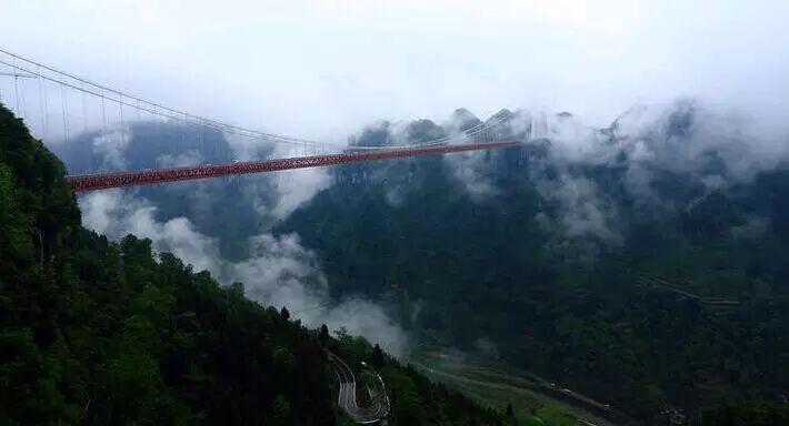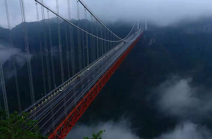 理由:它是长沙至重庆公路通道中吉首至茶峒高速公路的控制性工程,桥面与谷底垂直高差达330余米,主跨跨径1176米,是首座塔梁分离式悬索桥,创造性地采用“轨索移桥”架设新工艺进行主梁的安装架设。大桥跨越矮寨大峡谷,主跨居世界第三、亚洲第一。2012年3月31日,这座创“四项世界第一”的矮寨特大悬索桥正式通车。