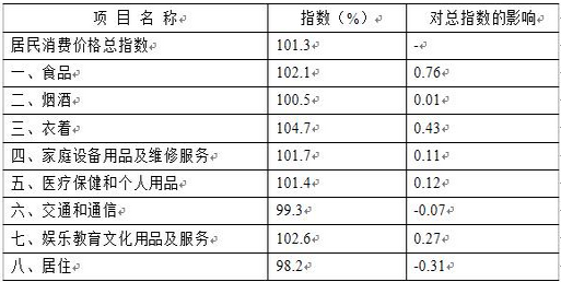 八大类商品及服务价格涨幅现“六涨二跌”态势。食品类价格上涨2.1%,拉动总指数上涨0.76个百分点,是拉动消费价格总水平上涨的主要因素。衣着上涨4.7%;娱乐教育文化用品及服务上涨2.6%;家庭设备用品及维修服务上涨1.7%,医疗保健和个人用品类价格上涨1.4%,烟酒类价格上涨0.5%;居住类降幅为1.8%,交通和通信类价格下降0.7%(见表2)。