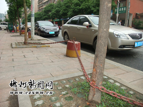 记者在现场看到,人行道边放置了6个水泥墩,一根粗大的铁链在行道树间绕过,并拴在每个水泥墩上。这根粗铁链把4棵行道树勒得伤痕累累。