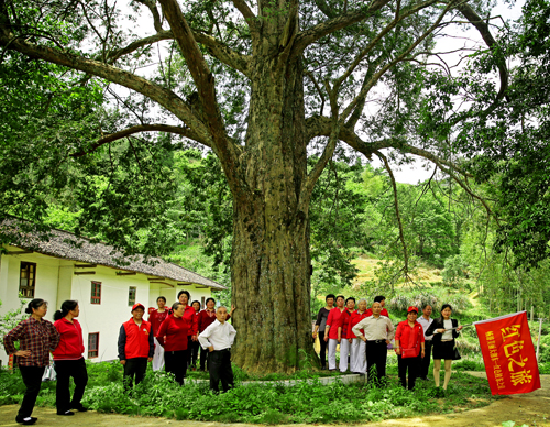 红网郴州站5月12日讯(邓仁湘 摄)5月8日,一旅游团在桂东县四都镇的国家一级保护植物红豆杉树下合影,这株蔸围6.8米的千年红豆杉,每日吸引游客纷至沓来。