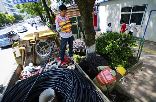 红网郴州站5月14日讯(记者 张一多 通讯员 周亮 摄)5月13日,市政工人在国庆北路铺设电缆。为提升城市品位,美化市容市貌,日前市政总公司对郴州市中心城区部分路段增加亮化设施,此次施工预计5月20日前全部完工。