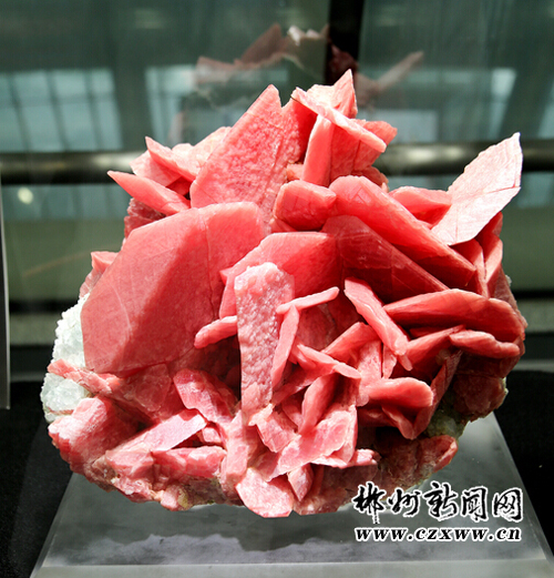 据国际矿物晶体收藏家、第三届矿博会招商组展览部负责人郑建蓉介绍,“中国皇帝”和“中国皇后”于2009年在广西苍梧县同时被发现,是目前中国发现的菱锰矿中体积最大、单晶最大、质量最好的两块,曾经震惊了2011年美国图森矿展。现收藏于中国博物馆。“中国皇后”体积略小,造型如一朵红玫瑰,美丽动人。两块晶体都被送往美国的TheCollector’sEdge矿物公司进行清洗修复,并被命名为“中国皇后”与“中国皇帝”。“中国皇后”归TheCollector’sEdge矿物公司所有。直到2013年,它终于得以回国在首届矿博会上露面。后江苏矿物文化研究中心馆长彭兆远经过多次交涉,终于成功将它留在中国,本届矿博会上,由于匆忙和疏忽,参展商将“中国皇后”遗留在了南京,为了及时赶上本届“矿博会”,连夜将“中国皇后”从南京运到了郴州,美丽的“中国皇后”再次展现在世人眼前。