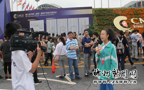 明星学校小记者的到访,吸引了众多参观者的眼球。他们在恐龙丹霞迎宾区、精品矿晶区、化石陨石区、精品宝石区、珠宝玉石区、雅石艺术区、根雕艺术区等8个展区中不断采访参观者和参展商的同时,也被湖南日报、郴州市交通频道等媒体的大记者追访,成为郴州国际会展中心一道靓丽的风景。特别是出镜小记者周辛娜以一口流利的英语采访外宾,让围观的群众啧啧称赞。