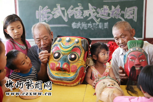 5月28日,在临武县大冲乡中心小学,国家级非物质遗产保护名录临武傩戏传承人正给孩子们讲解临武傩面具的寓意。当天,该县开展临武傩戏进校园活动,把非遗保护与传承从娃娃做起。