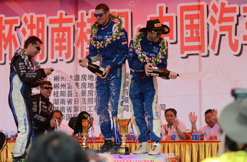 红网郴州站6月3日讯 (记者曲井泉)6月2日下午,2015年“蓉城之光城市广场”杯湖南桂阳·中国汽车拉力锦标赛在桂阳落下帷幕,经过两天的激烈角逐,来自一汽大众车队的车手克里斯托夫·阿特金森突出重围获得本站冠军。