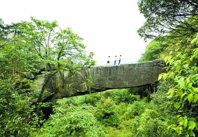 红网郴州站6月5日讯 6月3日,桂东县普乐镇齐云山景区,县国土资源局专家在对仙缘桥进行测量。该桥桥面海拔1427.80米、平均宽度1.85米、跨度25.93米,是我省海拔最高、跨度最大的天然石桥。此次测绘的数据将用于申报世界海拔最高的天然石桥。 (记者 童迪 通讯员 郭水清)