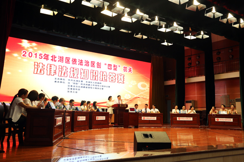 6月9日,在北湖区依法治区创“四型机关”法律法规知识抢答赛上,选手们精彩的表现,赢得了观众阵阵掌声。抢答赛现场选手在认真听题准备抢答。(记者 刘红亮 通讯员 李旭华摄)