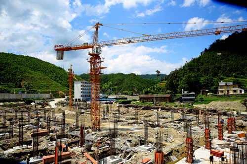 6月15日,桂东县新汽车站建设工地上,建筑工人正在紧张施工。