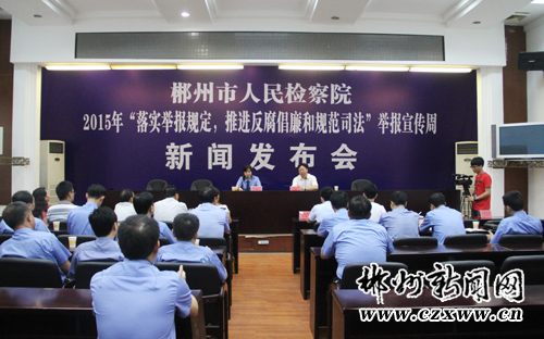 6月23日上午,郴州市2015“落实举报规定,推进反腐倡廉和规范司法”举报宣传周新闻发布会举行。