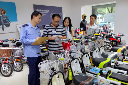 红网郴州站6月30日讯 日前,郴州市工商局联合专业检验机构对市城区、苏仙区和资兴市的电动自行车销售市场开展产品质量监测检测专项行动,重点检测产品的车速、总车重量等主要指标,本次共抽检了电动自行车样品15个批次,其中6个批次不合格,不合格率为40%,工商部门第一时间公布了检测结果并向社会发布消费警示。图为执法人员在市城区检测时的情形。